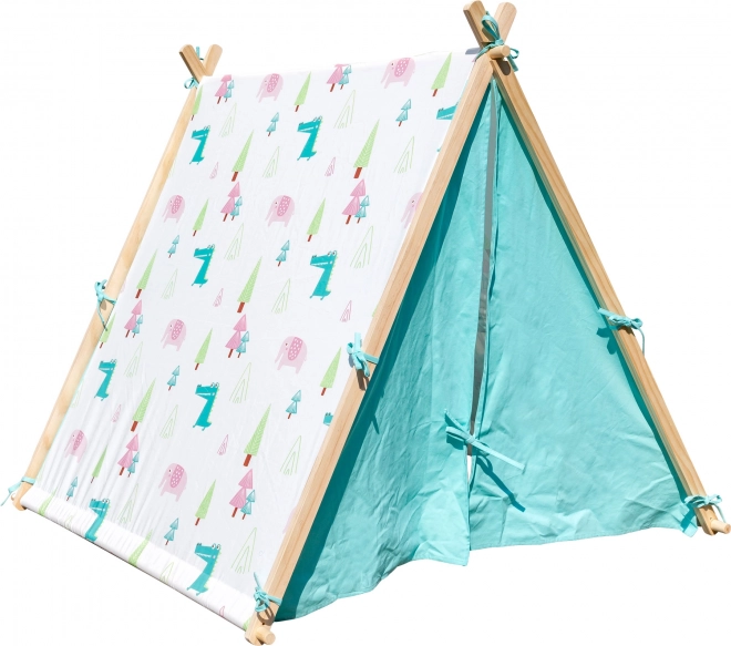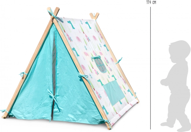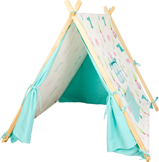 Igraći šator otisnut je razigranim uzorcima životinjica i stabala koji će privući pažnju svakog djeteta. Glavne boje su pastelno tirkizna i bijela.