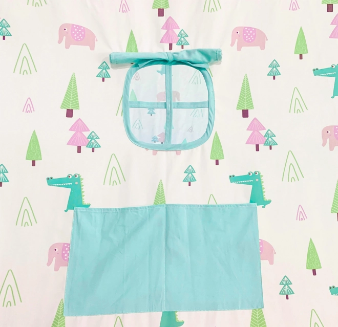 Šator ima prozirni prozorčić i džep koji služi za jednostavnu organizaciju igračaka. Motiv s ružičastim slonovima, tirkiznim krokodilima i stablima povećava atraktivnost.
