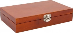 Čvrsta drvena kutija s metalnim zasunom štiti karte i kockice. Lako stane u ruksak ili kofer.