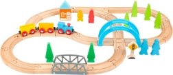 Set uključuje lokomotivu s vagonima, most, kućicu, stabla, figurice i prometne elemente za realistične scenarije. Prirodno drvo u kombinaciji s izraženim bojama djeluje atraktivno i potiče osjetilnu percepciju. Zahvaljujući kompatibilnosti s drugim drvenim sustavima, djeca mogu lako širiti svoj svijet tračnica.