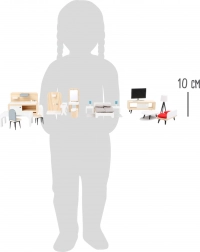 Stilizan i bezvremenski set namještaja SMALL FOOT pretvara svaku kućicu za lutke u ugodan dom. Kombinacija prirodnog drva i bijele boje djeluje čisto i moderno, a detalji poput jastučića, lampica i ogledala daju igri dozu realističnosti. Dijelovi su prilagođeni malim dječjim rukama te se odlikuju čvrstoćom i izdržljivošću.
