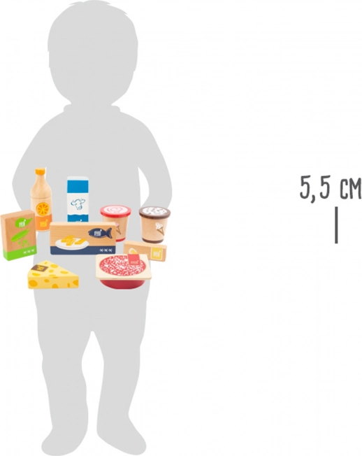 Set sadrži narančin sok, dva pakiranja sladoleda, pakiranje graška, riblje štapiće, maslac, sir, narezanu salamu i kutiju mlijeka. Realistični otisci i prirodan izgled privlače na prvi pogled. Zahvaljujući čvrstom drvu set je izdržljiv i spreman za svakodnevnu igru.