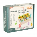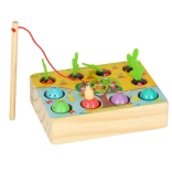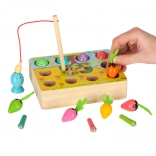 Zabavna drvena montessori igra uz koju djeca mogu uživati u “ribolovu” i vrtlarenju kod kuće. Pomoću magnetskog štapa love ribice i crviće, a mrkvice izvlače za filcane listiće. Razvija finu motoriku, koordinaciju oko–ruka, strpljenje i preciznost, učenje boja i taktilnu percepciju. Izrađeno od kvalitetnog drva s sigurnom netoksičnom bojom.