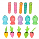 - 5× mrkvica, 5× crvić, 5× ribica, 1× magnetski štap, drvena baza