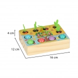 Povedite dijete na izlet do ribnjaka i u vrt – bez izlaska iz kuće. Igralna baza od masivnog drva skriva otvore za ribice, crviće i šarene mrkvice. Djeca ih love magnetskim štapom ili izvlače za filcane listiće, čime prirodno vježbaju hvat i osjećaj u prstima.