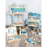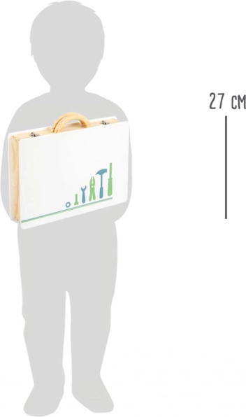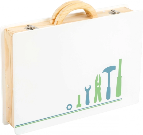 Njegovo pouzdano metalno zatvaranje i ručka prilagođena dječjim rukama omogućuju lako prenošenje. Set je izrađen u kombinaciji šperploče i masivnog drva, čime nudi visoku trajnost i niz korisnih poboljšanja. Djeca mogu birati između različitih dekorativnih stilova: radionica Miniwob i skandinavski Nordic.
