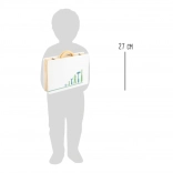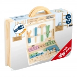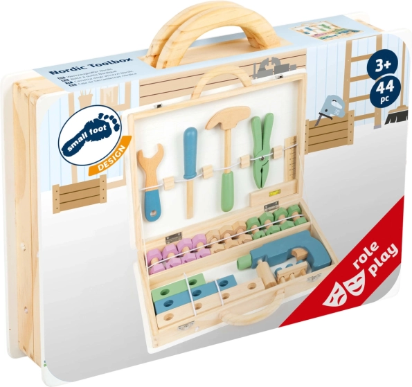 Drveni kovčeg s alatom za djecu Nordic nudi bezbroj mogućnosti za razvoj spretnosti i kreativnosti. Djeca mogu sastavljati razne konstrukcije zahvaljujući mnoštvu šarenih dijelova te čvrstim vijcima i maticama. Kovčeg je čvrst i izdržljiv, opremljen gumenim trakama za sigurno držanje alata.