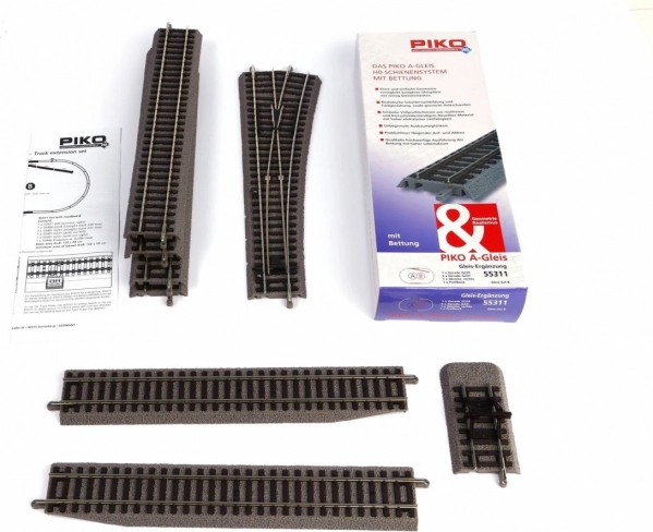 Kompletan PIKO željeznički set za mjerilo H0 s realističnom podlogom i vjernom teksturom pragova. Sadrži dva ravna odsjeka i jednostavnu skretnicu prema slijepom kolosijeku, koja se može ručno upravljati. Idealno za proširenje ovala – dovoljno je dodati lukove i ravni kolosijek s napojnim priključkom. Kvalitetna podloga osigurava stabilnost i tihi rad.