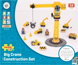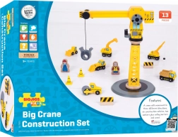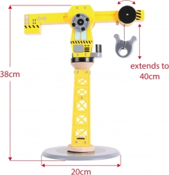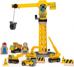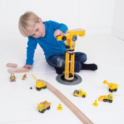 Ova kvalitetna drvena građevinska set-kutija s rotirajućom dizalicom i magnetskom kukom donosi djeci beskrajne mogućnosti igre. Zahvaljujući robusnoj izradi i sigurnim materijalima idealna je za svakodnevnu igru i razvoj vještina. Upečatljiva žuta izvedba građevinskih vozila odmah će privući djecu.