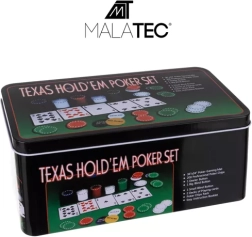 Sve što vam treba za kućni turnir: 200 žetona, 2 špila karata, funkcionalni žetoni i igraća podloga u jednom prijenosnom setu.