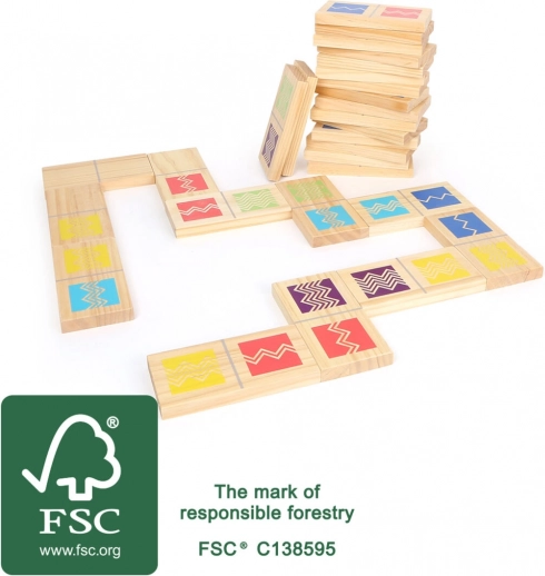 Domino XXL Active od small foot bezvremenska je društvena igra u maxi izdanju koja zabavlja djecu i odrasle. Svaka pločica izrađena je od 100% FSC certificiranog drva i ukrašena je živim bojama i šrafiranim uzorcima. Igrati se možete prema bojama ili prema šrafiranju – djeca tako vježbaju vizualno razlikovanje, koncentraciju i strateško razmišljanje.