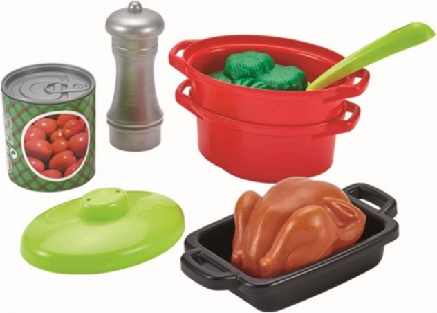 S ovim kompletnim setom posuđa djeca mogu uživati u beskrajnim satima kuhanja. Set uključuje lonce s poklopcima, tave, tiganj, pekač i razne namirnice koje doprinose realističnosti.