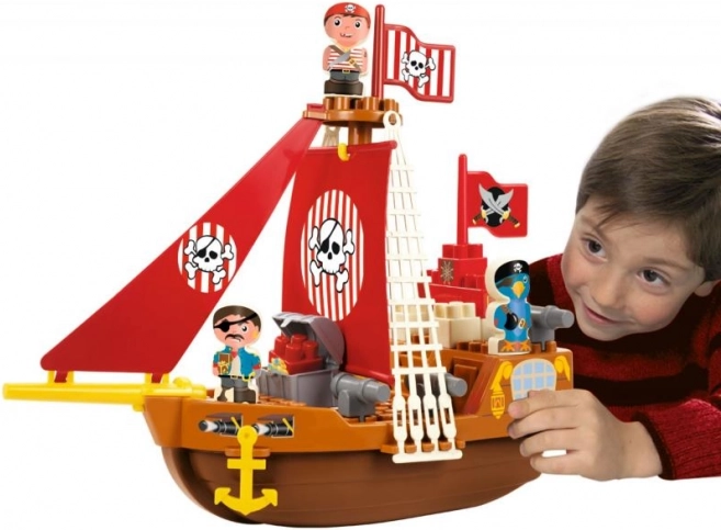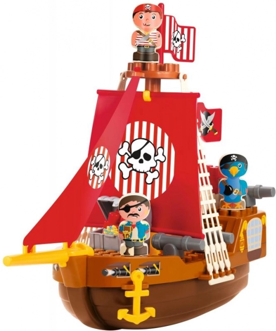 Brod je opremljen detaljnim komponentama poput crvenih jedara s motivom lubanje i prekriženih kostiju, koje djeci pružaju autentičan gusarski doživljaj.