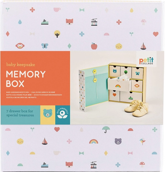 Sačuvajte prve dragocjenosti svoje bebe na stilski i održiv način. Ova dizajnerska kutija uspomena od Petit Collage nudi 7 ladica i praktičan džep za sitnice poput prve odjeće, pramenčića kose ili narukvice iz rodilišta. Izrađena od recikliranog papira i pakirana bez plastike, idealan je izbor za osviještene roditelje te kao originalan dar za rođenje djeteta.