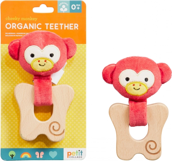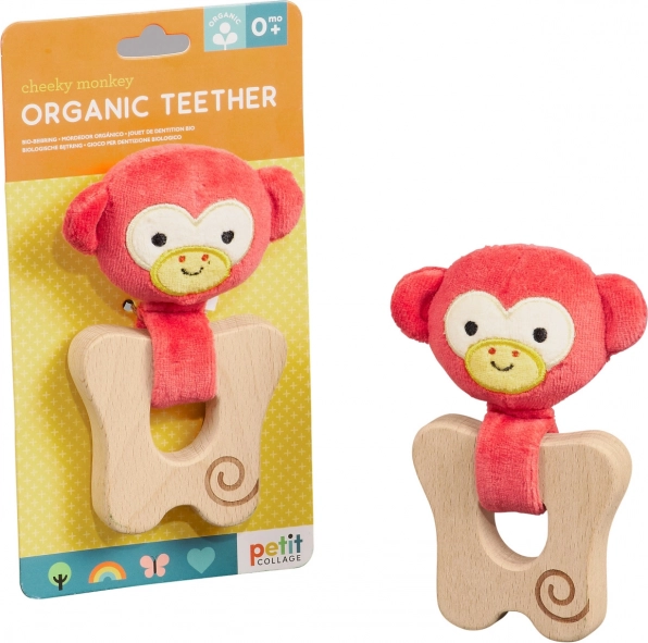 Preslatka grickalica Petit Collage u obliku majmunčića kombinira mekani organski pamuk i čvrsto FSC bukovo drvo za sigurno i umirujuće grickanje. Zahvaljujući lakom držanju za male ruke idealna je od rođenja i pomaže pri rastu prvih zubića. Izrađeno s obzirom na prirodu – bez plastične ambalaže i s punjenjem od recikliranih materijala.