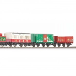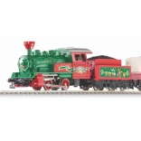 Parna lokomotiva 0-4-0 s tenderom, putnički vagon i dva teretna vagona u ujednačenom blagdanskom dizajnu. Savršeno za trenutačno stvaranje prave atmosfere.