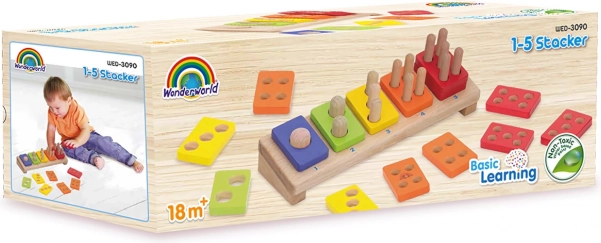 Ova kvalitetna drvena edukativna igračka djecu na prirodan način uči prepoznavati boje i razumjeti redoslijed brojeva 1–5. Svaka pločica ima odgovarajući broj otvora, a djeca ih nižu na štapiće u postolju, čime vježbaju brojanje i logičko razmišljanje.
