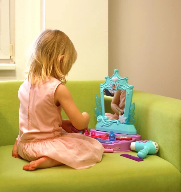 Ovaj stilski toaletni set u tirkizno-ljubičastoj kombinaciji boja donosi djeci sate stvaralačke zabave. Glavna atrakcija je zrcalo sa svjetlosnim i zvučnim efektima – nakon aktivacije pokreće melodije koje pojačavaju atmosferu pri igri frizerskog ili kozmetičkog salona.