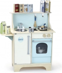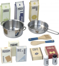 Zahvaljujući robusnoj drvenoj konstrukciji kuhinjica je stabilna i izdržljiva. Sadrži kuharsku kapu i pregaču, soljenku i paprenku, kuhaču, lonac, tavu i namirnice u tetrapacima – sve spremno za maštovito kuhanje. Nakon raspakiravanja potrebna je jednostavna montaža.