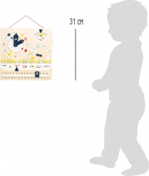 Pregledna drvena ploča kombinira sat, kalendar i pokazatelje vremena. Šareni elementi i jasni piktogrami olakšavaju razumijevanje i potiču zabavno učenje svaki dan.