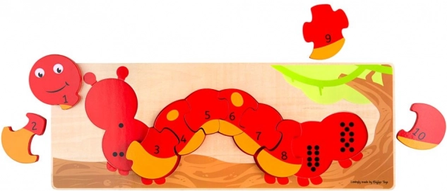 Računalna slagalica gusjenica BIGJIGS TOYS spaja učenje i igru. Djeca slažu numerirane dijelove 1–10 na drvenu podlogu s crnim točkicama koje odgovaraju broju na dijelu. Time učvršćuju razumijevanje količine, boja i oblika te istovremeno vježbaju koordinaciju oko–ruka.