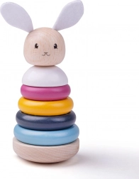 Ova kvalitetna drvena slagalica u pastelnim bojama idealna je prva edukativna igračka. Djeca slažu prstenove od najvećeg do najmanjeg, jačaju koordinaciju oko–ruka i uče razlikovati boje i oblike. Tekstilne uške i repić zeca dodaju taktilnu dimenziju igri.