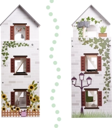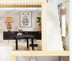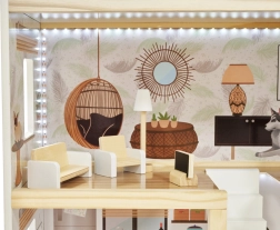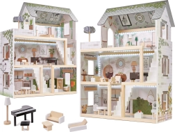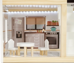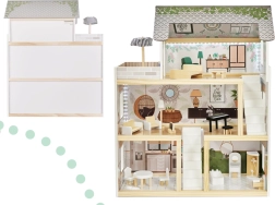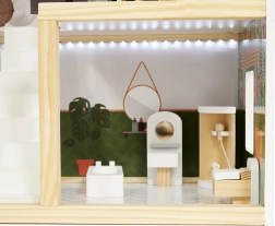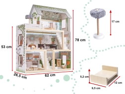 Drvena kućica za lutke LULILO Floro izrađena je u boho stilu, što je čini ne samo lijepom već i funkcionalnom. Sa tri kata i prostranom terasom nudi dovoljno prostora za razne scenarije i igre. Kućica je opremljena s četiri prostorije: kuhinjom, kupaonicom, dnevnim boravkom i spavaćom sobom, pri čemu je svaka prostorija bogato opremljena kao u pravom domu.
