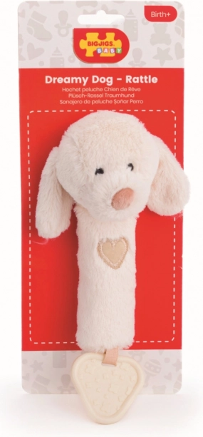 Slatki psić od Bigjigs Baby spaja zvečku, zviždaljku i grickalicu u jednoj igrački. Izrađen je od mekih, sigurnih materijala nježnih prema dječjoj koži. Zahvaljujući praktičnoj veličini za male ručice potiče razvoj osjetila, umiruje nadražene desni i ispunjava europske sigurnosne standarde. Idealan dar za novorođenčad i bebe 0+.