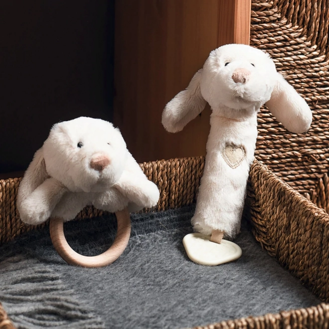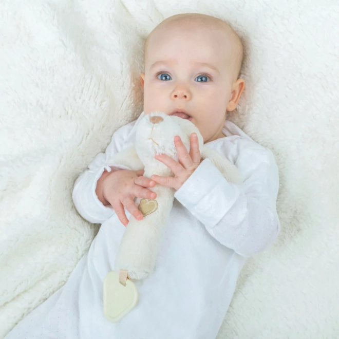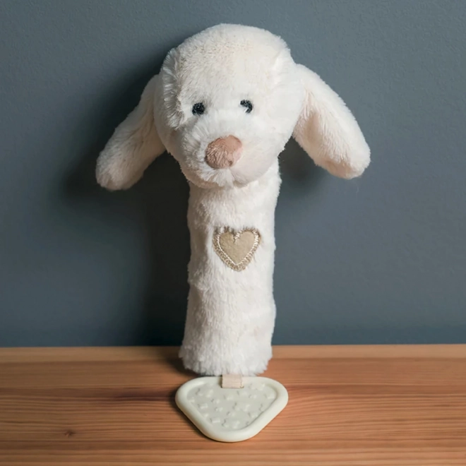 Ova višenamjenska mekana igračka u obliku psića nudi djeci tri doživljaja u jednom: nježno zveckanje za stimulaciju sluha, zabavno zviždanje pri pritisku i teksturiranu grickalicu za olakšanje kod nicanja zubića. Neutralan prirodni ton uklapa se u svaku opremu za bebe.