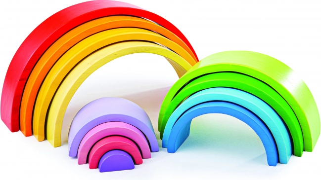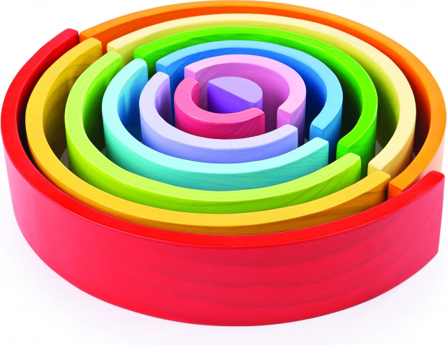 Velika drvena duga bezvremenska je edukativna igračka koja potiče otvorenu igru bez pravila. Djeca mogu lukove slagati, nivelirati, povezivati i kombinirati s drugim građevnim setovima – mogućnosti su gotovo beskrajne. Zahvaljujući robusnoj izradi i glatkoj površini, s dugom je ugodno rukovati, a odolijeva svakodnevnoj igri.