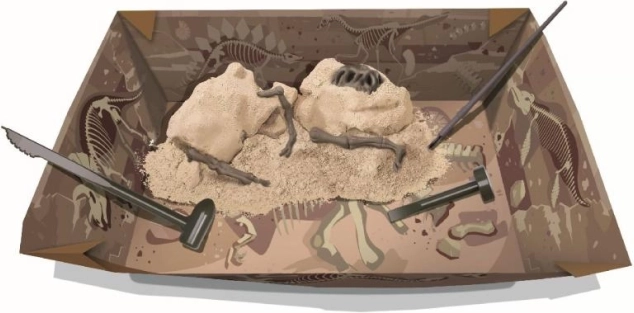 Djeca postupno otkrivaju skrivene fosile u gipsanom bloku te uče strpljenju i pravilnim postupcima pri iskopavanju. Realističan doživljaj istraživačkog rada kod kuće.