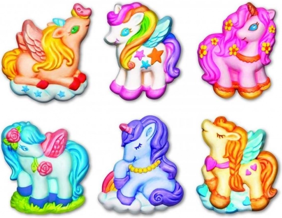 Izradite i oslikajte sjajne gipsane magnete za hladnjak ili broševe u obliku 6 simpatičnih jednoroga. Idealno za razvoj dječje kreativnosti.