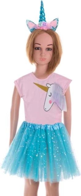 Ovaj čarobni kostim razveselit će svaki bal i dječju maštu. Til suknja u baletnom stilu je lagana, sjajna i zahvaljujući rastezljivom struku lako se prilagođava. Obruč je ukrašen mekanim rogom i svjetlucavim ušima – savršen dodatak za malu vilu ili čarobnicu.