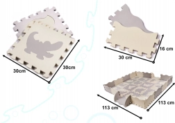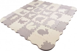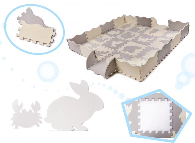 Velikog formata pjenasti dijelovi s izvadivim životinjskim oblicima potiču učenje oblika, kreativnost i finu motoriku. Od dijelova lako složite ravnu podlogu ili ogradicu s povišenim rubovima koja definira sigurnu zonu za igru. Teksturirana površina ugodna je na dodir i ne kliže.