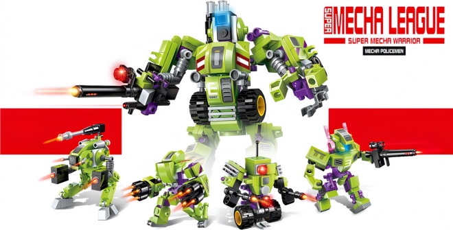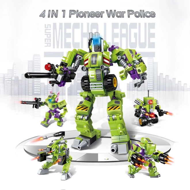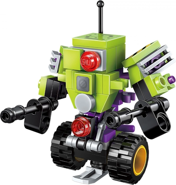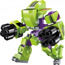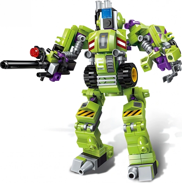 Set omogućuje izradu različitih modela, uključujući velikog oklopnog robota, a kompatibilan je s drugim građevnim setovima.
