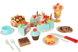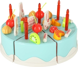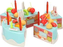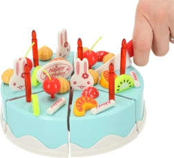 Ovaj šareni set s plavom rođendanskom tortom idealan je za igre proslave i dječju kuhinju. Torta se sastoji od 6 dijelova povezanih čičkom, pa je djeca mogu rezati priloženim plastičnim nožem, preslagivati i ponovno ukrašavati. Bogata oprema – od svijeća i voća do simpatičnih zečića i natpisa „Happy Birthday“ – potiče kreativnost i razvoj mašte.