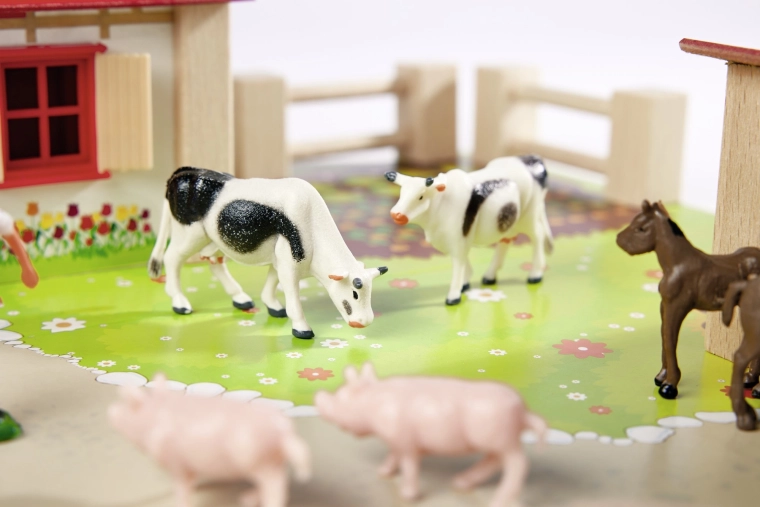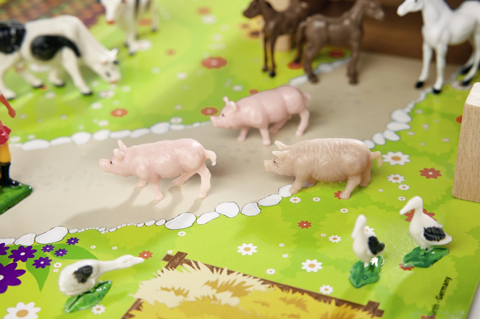 - kućica, štala, šarena podloga, ograde/plotovi, naljepnice, 12 figurica (3 praščića, 2 krave, 3 guske, 3 konja, farmerica)