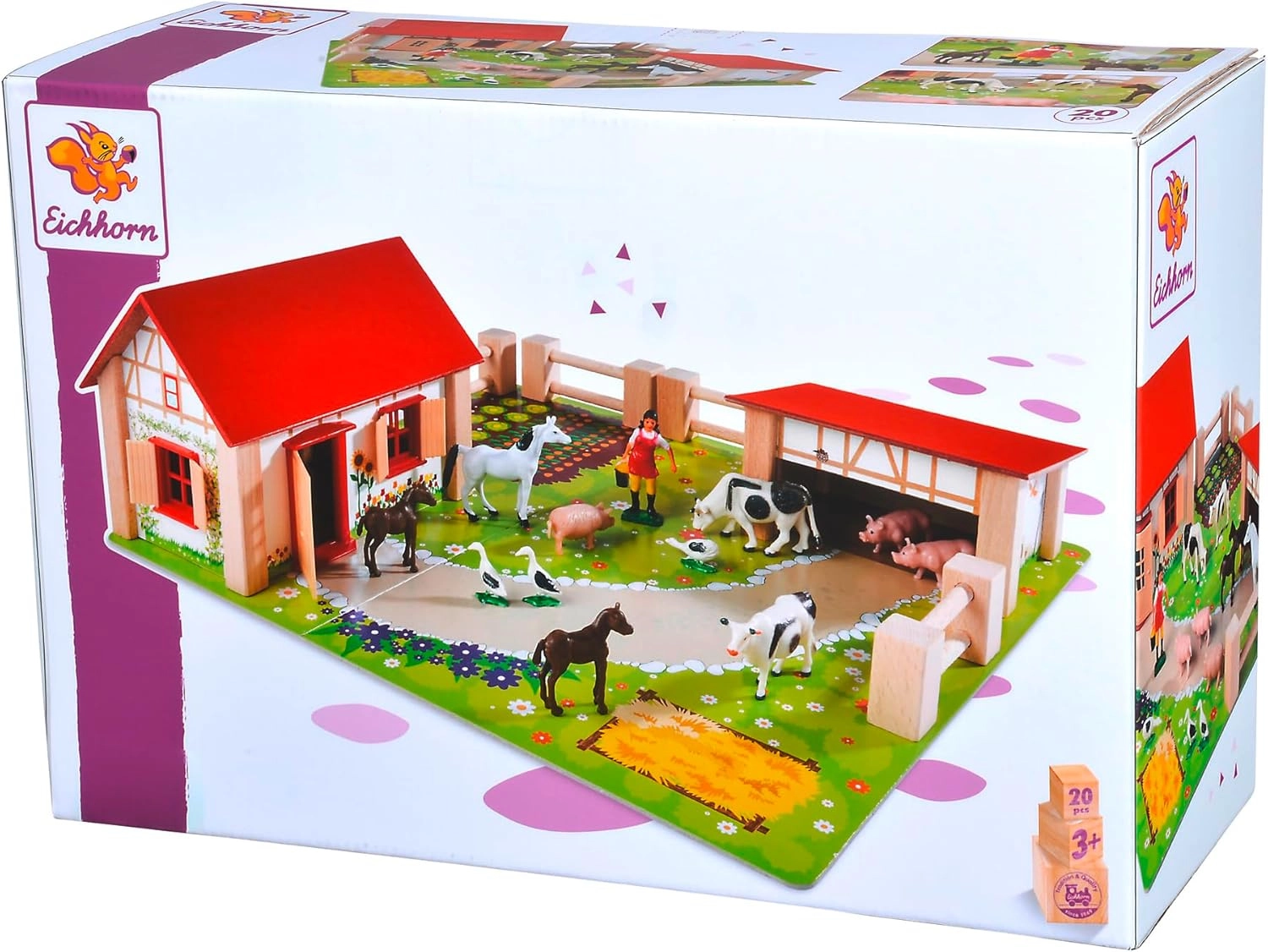 Drvena farma EICHHORN razveselit će svakog malog farmera. Set sadrži kućicu s crvenim krovom, štalu, ograde i detaljne figurice životinja uključujući konjiće, kravice, praščiće i guske. Dio seta je i šarena podloga sa stazama i vrtom koja djecu lako navodi na stvaranje vlastitih scena i priča. Čvrsta drvena konstrukcija i izdržljivi materijali osiguravaju dugi vijek trajanja i sigurnu igru.