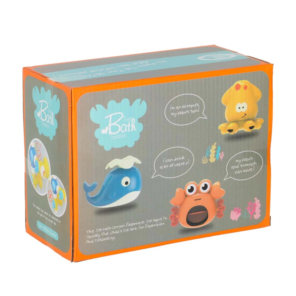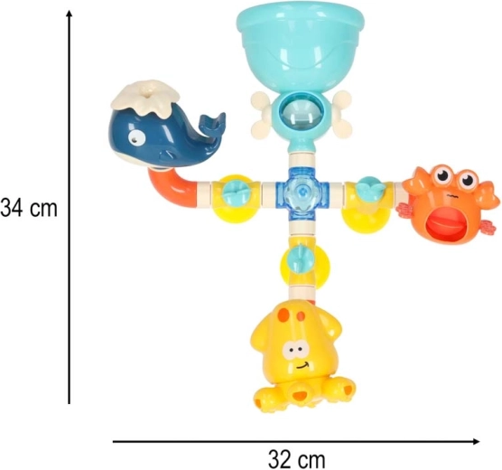 Ova šarena vodena staza za kadu sastoji se od lijevaka, cijevi i veselih izlaza u obliku kita, raka i hobotnice. Djeca jednostavno uliju vodu odozgo i prate kako protječe sustavom, pokreće kotačiće te istječe iz različitih otvora kao fontana ili slap. Sigurni materijali i zaobljeni rubovi idealni su za svakodnevnu vodenu igru.