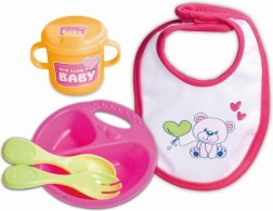Tanjur, žličica, vilica, šalica s ručkama i tekstilni podbradnik – sve u jednom pakiranju za realistično hranjenje lutke.