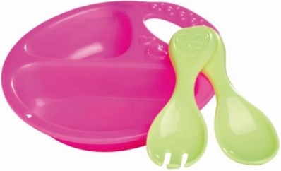 Lagano plastično posuđe sa zaobljenim oblicima i ergonomski pribor potiče samostalnu igru i finu motoriku.