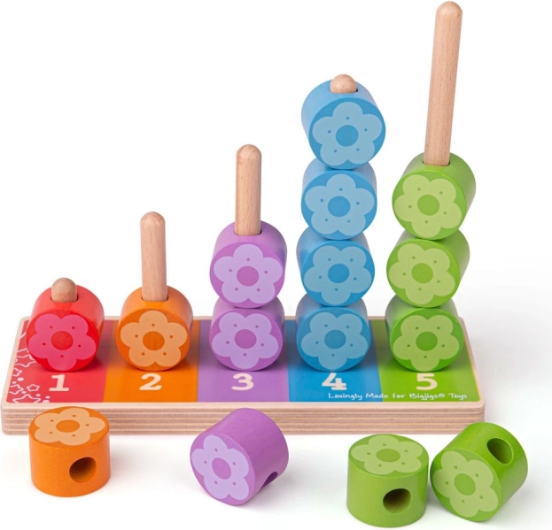 Vesela edukativna drvena igračka koja djecu uči razlikovati boje, brojati od 1 do 5 i trenirati finu motoriku. Šareni cvjetići lako se stavljaju na numerirane klinove, što potiče koordinaciju oko–ruka i koncentraciju. Izrađeno od kvalitetnog drva i u skladu s europskim sigurnosnim standardima.