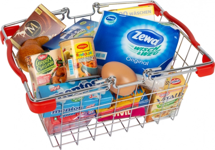 Zabavna i izdržljiva košarica za kupovinu za djecu od 3 godine, napunjena maketama uobičajenih proizvoda. Podržava igru trgovine, razvija maštu i socijalne vještine. Metalna izvedba s plastičnim štitnicima na uglovima za veću sigurnost i dug vijek trajanja.