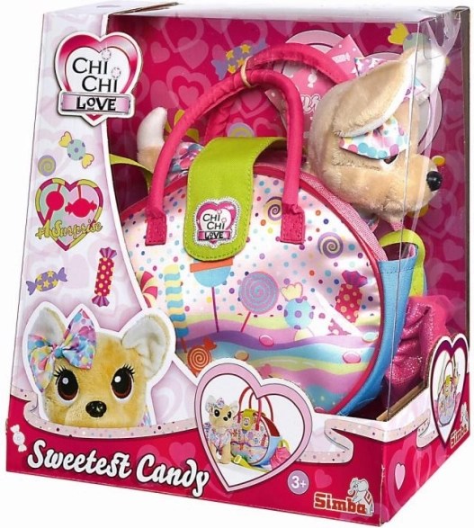 Preslatki chihuahua CHI CHI LOVE iz edicije Sweetest Candy razveselit će svako dijete stilskom torbicom u obliku slatkiša, praktičnom naramenicom i razigranim privjescima. Psić od mekane plišane tkanine visok je 20 cm, idealan za maženje i putovanja te odlično potiče empatiju. Savršen poklon za djecu od 3 godine nadalje.
