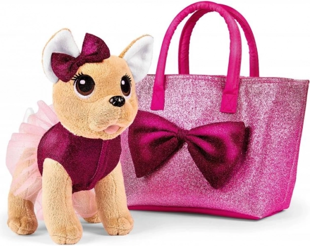 Plišana čivava s mašnom u ružičastoj sjajnoj odjeći s torbom s mašnom. Veličina 20 cm.