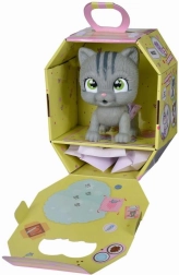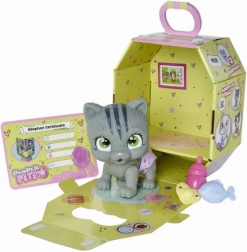 Set sadrži: mačiće od 15 cm s pelenom, funkciju piškanja, 3 iznenađenja i certifikat o usvajanju. Sve je zapakirano u elegantni papirnati okvir koji može služiti kao prijenosni dom. Poklon pribor zapakiran je u posebne vrećice.