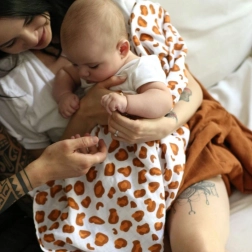 Zahvaljujući velikodušnim dimenzijama 120 × 120 cm idealna je za povijanje, prekrivanje i svakodnevnu njegu kod kuće i na putu. Stilski motiv bijeli leopard razveselit će roditelje koji traže praktičan dodatak s modernim dizajnom.