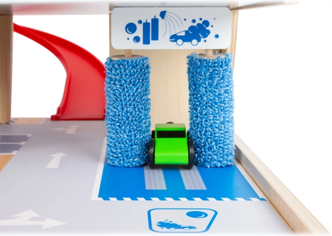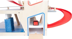 Praonica s rotirajućim četkama daje igri dozu realističnosti, dok gumena zaštitna ograda na katovima sprječava ispadanje autića i povećava sigurnost pri vožnji.