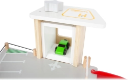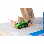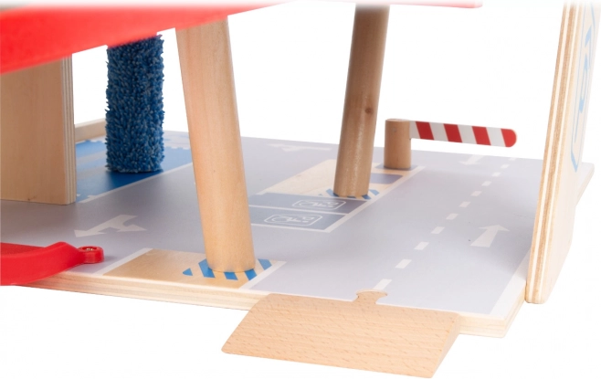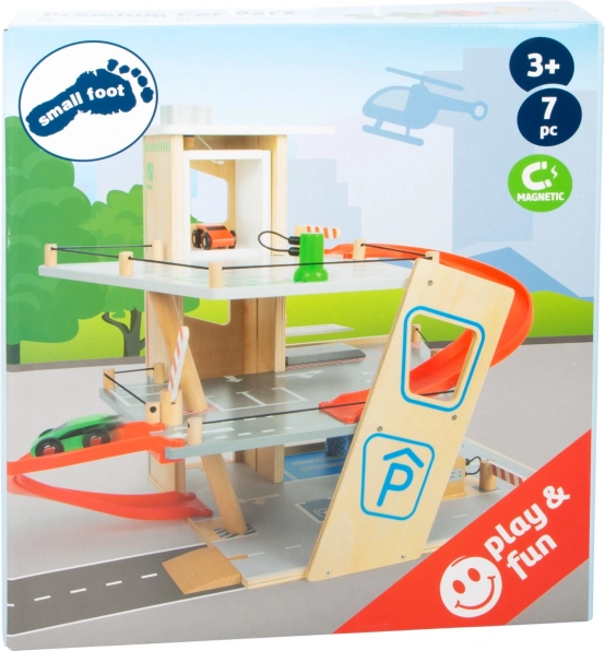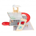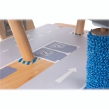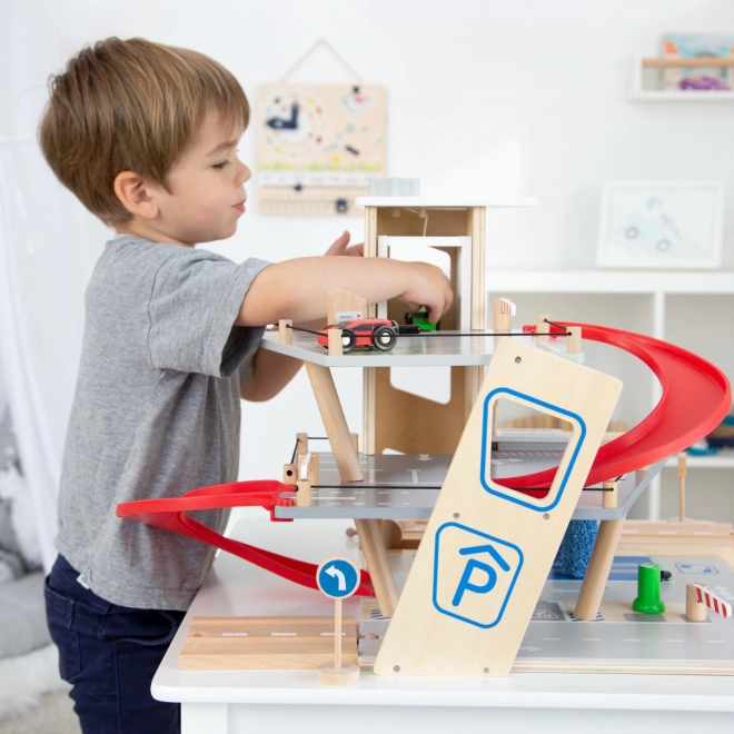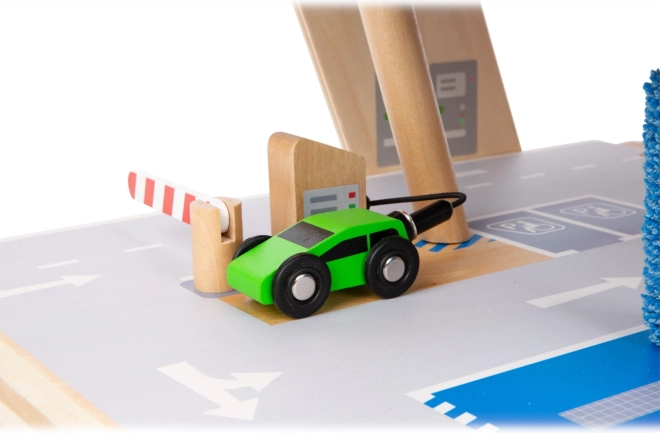 Otkrijte robusno drveno parkiralište s tri kata, funkcionalnim dizalom i glatkim rampama za beskrajnu igru autićima. U kompletu su dva auta, benzinska postaja, punjač za električna vozila, dizač vozila, realistična autopraonica s četkama i mehaničke rampe/barijere na svakom katu. Sigurnu vožnju osigurava gumena zaštitna ograda, a detaljna signalizacija razvija prometnu svijest.