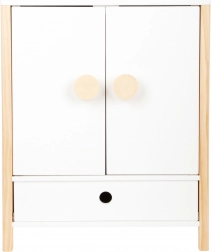 Ovaj stilski ormarić za lutke iz linije Little Button spaja čiste linije, prirodne materijale i funkcionalnu unutarnju organizaciju. Djeca imaju sve nadohvat ruke: vješalicu s ramenicama za vješanje haljinica, uklonjive police za dodatke i prostranu ladicu za sitnice. Minimalistička izvedba s nježnim tonovima prirodno se uklapa u moderan interijer.